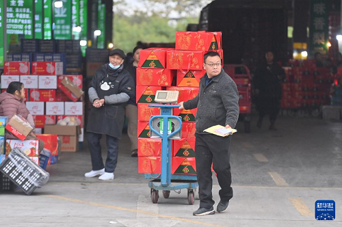 2月11日,在柳州市柳南區(qū)瑞龍路一家農(nóng)產(chǎn)品批發(fā)市場,商家在搬運(yùn)水果。(新華社記者 黃孝邦 攝)
