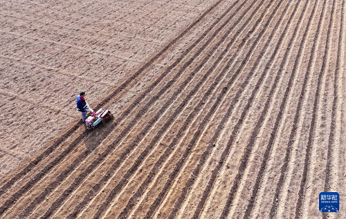 2月13日,在山東省棗莊市山亭區(qū)桑村鎮(zhèn),農(nóng)民駕駛農(nóng)機(jī)開溝準(zhǔn)備播種馬鈴薯(無(wú)人機(jī)照片)。(新華社發(fā) 李宗憲 攝)