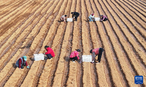 2月13日,在山東省棗莊市山亭區(qū)桑村鎮(zhèn),農(nóng)民在播種馬鈴薯(無(wú)人機(jī)照片)。(新華社發(fā) 李宗憲 攝)