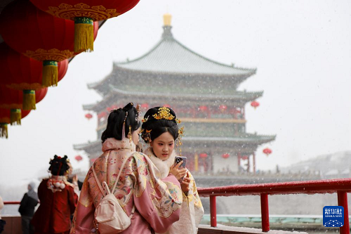 2月23日,游客在陜西省西安市鐘樓旁賞雪拍照。(新華社發(fā) 薛剛 攝)