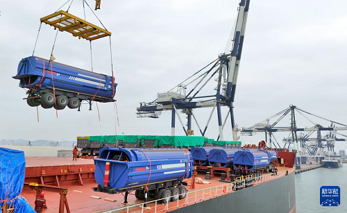 2月24日,在山東港口煙臺港,工人將出口卡車吊裝上船(無人機照片)。(新華社發(fā) 唐克 攝)
