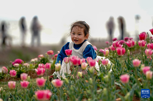 2月26日,一名小朋友在滇池邊一處郁金香花叢旁拍照。(新華社記者 陳欣波 攝)