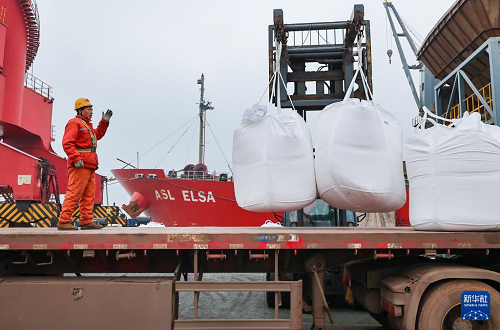 3月4日,工人在江蘇連云港港東方港務(wù)分公司碼頭接運(yùn)進(jìn)口的化肥。(新華社發(fā) 王健民 攝)