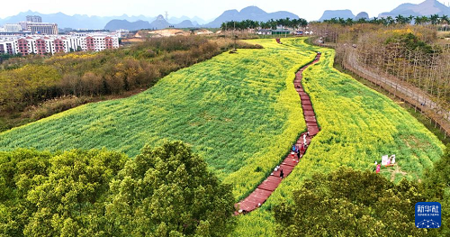 3月5日,游客在廣西來(lái)賓市忻城縣的油菜花田中游玩(無(wú)人機(jī)照片)。(新華社發(fā) 樊紹光 攝)