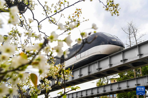 3月18日,云巴穿梭在重慶市璧山區(qū)的花帶中。(新華社記者 唐奕 攝)