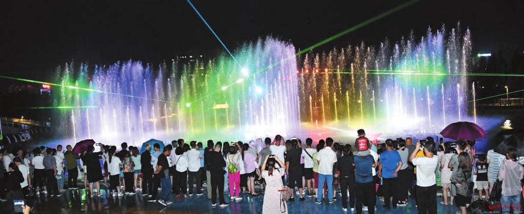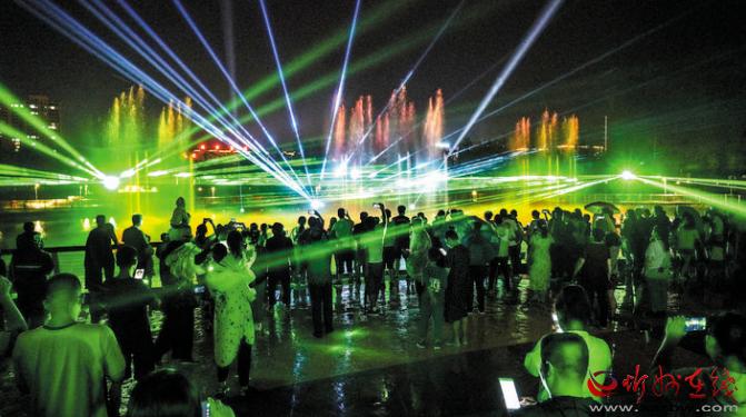 公園在注重園林、景觀建設(shè)的同時,突出主題文化內(nèi)涵的展現(xiàn),湖水噴泉、觀賞果園、主題植物園、階梯花臺等特色園林具有觀賞性,園內(nèi)還配套建有遺山文化館、張拉膜廣場、健舞劇場、休閑茶吧、咖啡館等群眾休閑活動場所,是又一惠及民生的心靈家園。圖為8月1日晚,市民在遺山公園噴泉廣場觀賞絢麗多彩的噴泉燈光秀。劉紀(jì)森 智芝龍 白曉明 胡 煒 攝