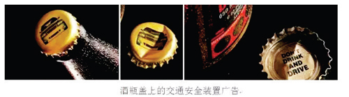 美國將警示語作為酒品包裝的強制性標注內(nèi)容,要求飲料,酒的品牌標簽、獨立的前標簽或者背標簽、側(cè)標簽都應獨立,并有別于標簽中其他信息地標示:“政府警示,根據(jù)普通外科醫(yī)生建議,孕婦不應該飲酒,以防止新生兒缺陷,飲酒會減弱個人駕駛車或操控機械的能力并可能引發(fā)健康問題。”此外,國外的產(chǎn)品包裝設計上也植入了公益理念。如上圖廣告可對飲酒人群針對性的進行廣告宣傳,采用打開酒瓶蓋必須以破壞“車輛”為代價的形式,傳達喝酒不能開車的安全理念。