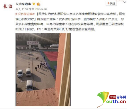 中國青年網(wǎng)記者就此事向武鄉(xiāng)縣職業(yè)中學進行求證,該校辦公室劉老師稱,目前有二十余位同學在縣人民醫(yī)院住院治療。事情發(fā)生后學校領導高度重視,縣領導和教育局領導也都前往醫(yī)院看望生病學生。