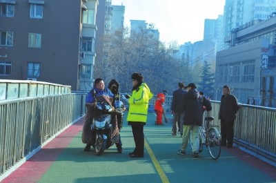 京華時(shí)報(bào)訊(記者張思佳)昨天,朝陽呼家樓交通大隊(duì)的交警在雙井橋北一過街天橋上,對(duì)在天橋上騎行電動(dòng)車者進(jìn)行處罰,騎行者當(dāng)場被罰款20元。這是交管部門首次對(duì)電動(dòng)車騎行橫穿過街天橋進(jìn)行處罰。
