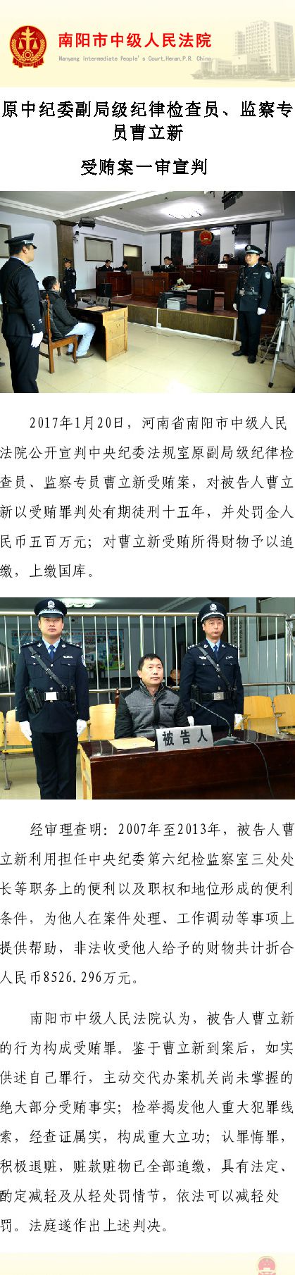 據(jù)南陽市中級人民法院官方微博消息,2017年1月20日,河南省南陽市中級人民法院公開宣判中央紀委法規(guī)室原副局級紀律檢查員、監(jiān)察專員曹立新受賄案,對被告人曹立新以受賄罪判處有期徒刑十五年,并處罰金人民幣五百萬元;對曹立新受賄所得財物予以追繳,上繳國庫。