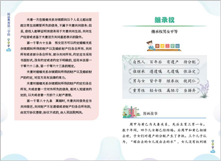 該書選取繼承權(quán)、高鐵霸座、高利貸、高空拋物等百姓經(jīng)常遇到和關(guān)心的熱點(diǎn)問題,結(jié)合法律知識(shí)與中華傳統(tǒng)文化,以三字一句的形式,配之經(jīng)典案例和四格漫畫,增強(qiáng)了普法宣傳的感染力。(孝金波、劉霞)