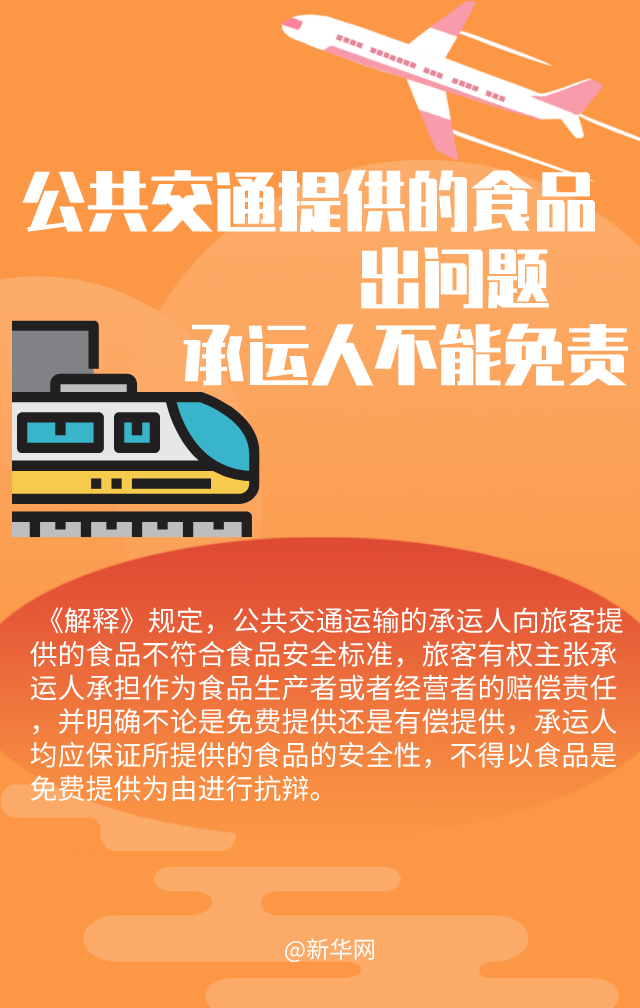 《解釋》規(guī)定,公共交通運輸?shù)某羞\人向旅客提供的食品不符合食品安全標(biāo)準(zhǔn),旅客有權(quán)主張承運人承擔(dān)作為食品生產(chǎn)者或者經(jīng)營者的賠償責(zé)任,并明確不論是免費提供還是有償提供,承運人均應(yīng)保證所提供的食品的安全性,不得以食品是免費提供為由進行抗辯。