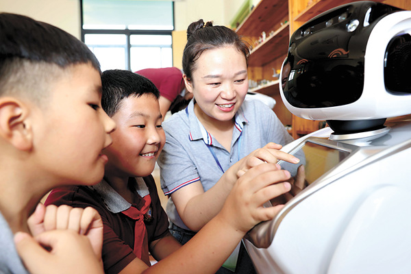 為緩解未成年人假期“看護(hù)難”問題,安徽省合肥市瑤海區(qū)試點(diǎn)免費(fèi)提供音體美興趣培養(yǎng)、公益看護(hù)、讀書賞析、作業(yè)輔導(dǎo)、科技創(chuàng)新等為主要內(nèi)容的“五彩假日”托管和教育服務(wù)。圖為孩子們在和機(jī)器人做互動游戲。 新華社發(fā)(解琛 攝)