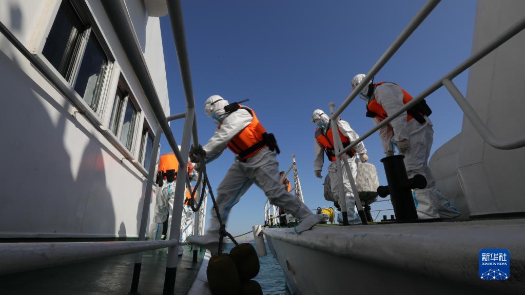 山東海警局執(zhí)法員跳幫嫌疑船只進(jìn)行檢查(2022年4月1日攝)。新華社發(fā)(韓剛 攝)