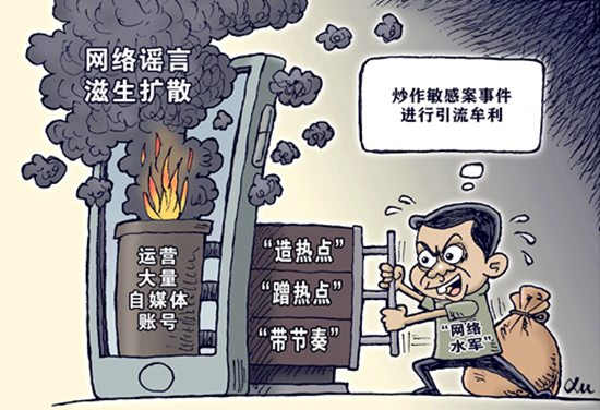 編造傳播虛假信息“造熱點”“蹭熱點”“帶節(jié)奏”,炒作敏感案事件進(jìn)行引流牟利,開設(shè)假冒媒體網(wǎng)站和自媒體賬號,打著“輿論監(jiān)督”等旗號,實施敲詐勒索……這些行為被公安機(jī)關(guān)嚴(yán)厲打擊。徐駿/作(新華社發(fā))