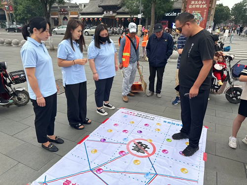 活動現(xiàn)場,在一個特殊的攤位上,由近到遠分別擺放著“冰毒”“海洛因”“搖頭丸”等各種眼花繚亂的毒品仿真模型?!皝韥韥恚哌^路過不要錯過!”“瞧一瞧,看一看!”禁毒社工在“攤位”前賣力吆喝著,一陣陣吆喝聲引來了眾多游客,游戲通過套圈的方式,組織游客套中現(xiàn)場的毒品模型并準確說出毒品名稱即可獲得扇子、手機支架、帆布包等獎勵。