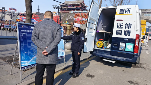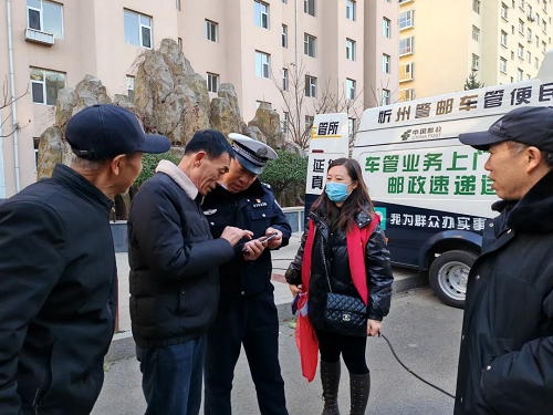 春節(jié)假期,城市、鄉(xiāng)村到處都彌漫著歡樂祥和的氣氛,初一至初七,在山西省忻州市忻府區(qū)光明西街古城北廣場、公園西街世紀花苑小區(qū)南門等人流量大、人員集中場所,忻州市公安局交警支隊的警郵車管便民服務(wù)車格外顯眼。“縮短距離、延伸真情”,這輛承載著為駕駛?cè)颂峁崆橹艿椒?wù)、為車輛安全出行提供保障,被群眾稱為“流動車管所”的車管便民服務(wù)車讓寒冬暖流涌動。