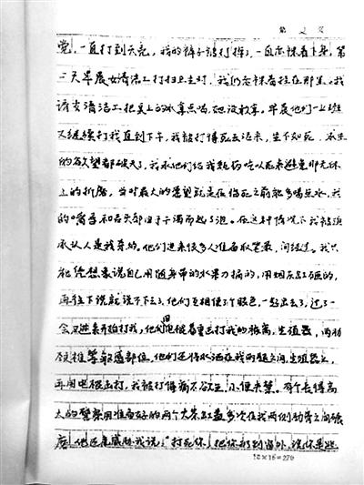 劉吉強(qiáng)還撰寫了一封控告信??馗嫘爬铮枋隽?天夢(mèng)魘般的經(jīng)歷:辦案人員用腳踢他的臉,用手銬把他吊掛在鐵管做的橫梁上拳打腳踢,用電棍擊打身體的各部位。