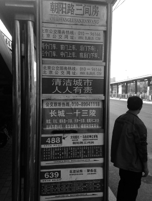 5日,記者來(lái)到朝陽(yáng)區(qū)三間房公交車(chē)站,見(jiàn)站牌上除了488路、639路站牌和兩塊公益提示牌外,中間出現(xiàn)了一塊顯示著“公交旅游熱線,長(zhǎng)城——十三陵”的牌子,牌子下方還有一排小字,寫(xiě)著北京一些著名景點(diǎn)的一日游,往返車(chē)費(fèi)50元。記者注意到,不同于其他站牌,這塊公交旅游熱線為不干膠質(zhì)地,表面嶄新干凈,明顯剛粘貼上不久,而正規(guī)公交站牌則是不銹鋼的鋼板。