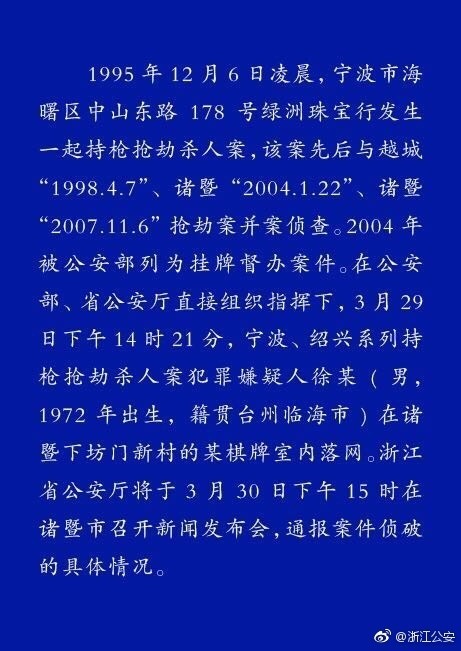 最新消息:浙江省公安廳將于3月30日下午15時(shí)在諸暨市召開新聞發(fā)布會(huì),通報(bào)案件偵破的具體情況。