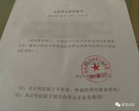 在派出所開具的證明書的中間打了括號,里面寫著:“請問教育部門,小孩讀書與其父母有無犯罪有關嗎?難道小孩的父母有違法犯罪記錄,就可以剝奪小孩讀書權利嗎?”