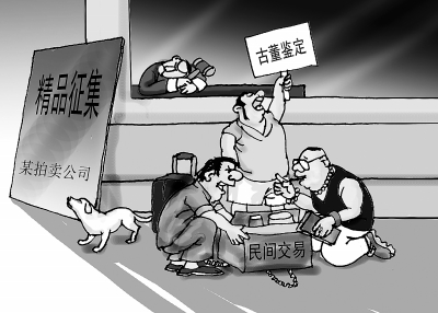 “前些年他們都會把家中所藏寶貝送到拍賣行去,現(xiàn)如今不少公司關(guān)門大吉,只好改街邊交易了。”人送外號“鐵拐李”的老李早些年也是藝術(shù)拍賣會的常客,看到街邊的熱鬧買賣,也不由心動。但在業(yè)內(nèi)人士看來,私下買賣固然方便,可潛藏的風(fēng)險不容小覷。