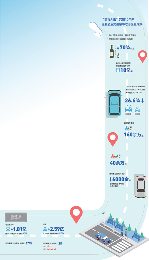 “總體來(lái)看,自2011年‘醉駕入刑’至2020年,全國(guó)機(jī)動(dòng)車增加1.81億,駕駛?cè)嗽黾?.59億,年均增長(zhǎng)1800萬(wàn)輛、2600萬(wàn)人,但10年來(lái)全國(guó)交通安全形勢(shì)總體穩(wěn)定?!?公安部交通管理局相關(guān)負(fù)責(zé)人說(shuō),這一成績(jī)的取得,“醉駕入刑”功不可沒(méi),挽救了無(wú)數(shù)生命,也讓無(wú)數(shù)家庭得以平安。