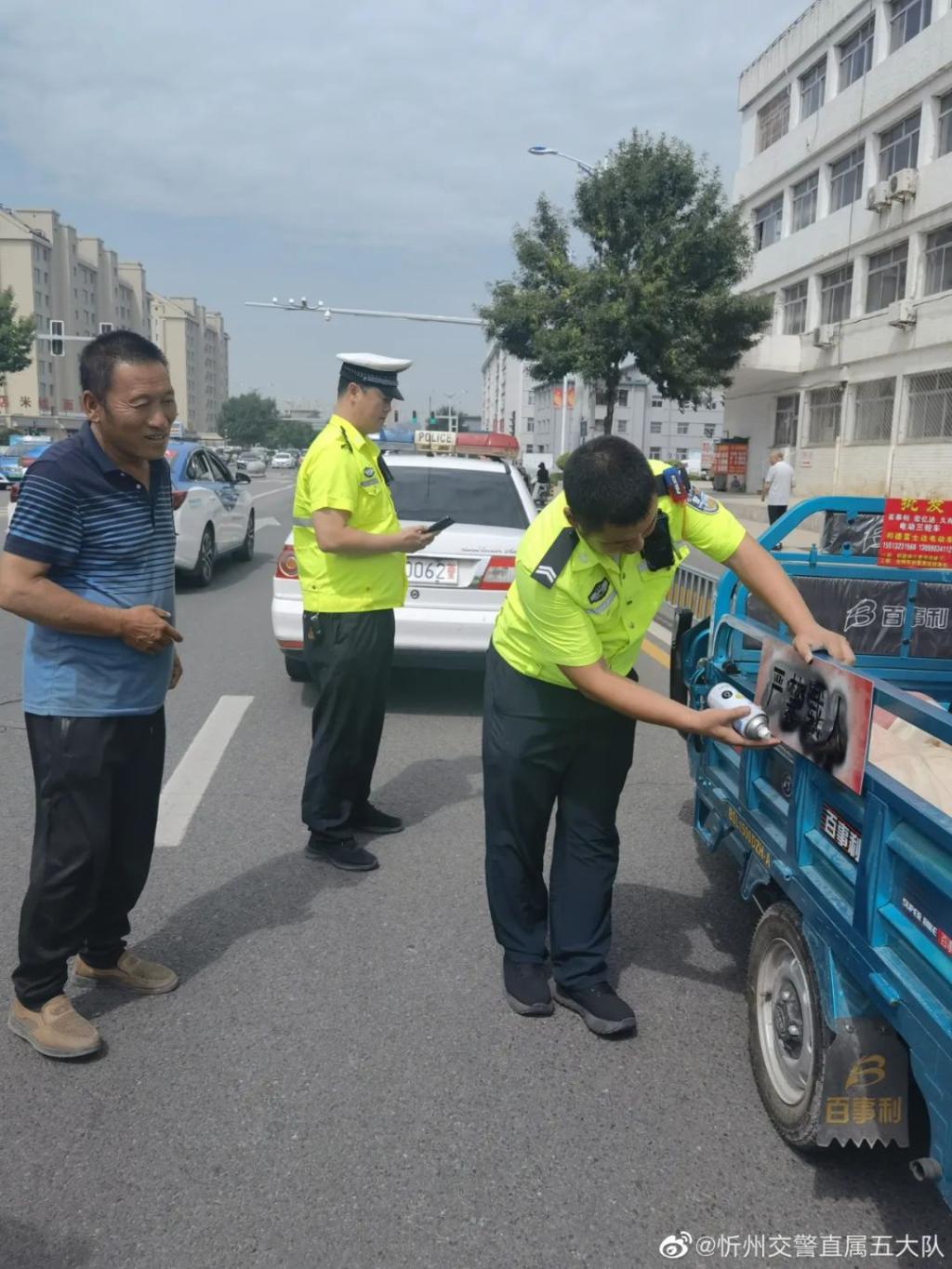7月13日上午,忻州市公安局交警支隊(duì)直屬四大隊(duì)民警走進(jìn)莊磨鎮(zhèn)集貿(mào)市場(chǎng)開(kāi)展三輪車(chē)違法載人交通安全宣傳活動(dòng)。