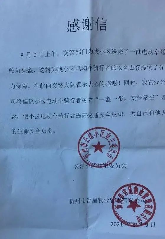 業(yè)主委員會表示衷心感謝交警大隊(duì)送來頭盔,為大家的安全出行提供了有力保障。
