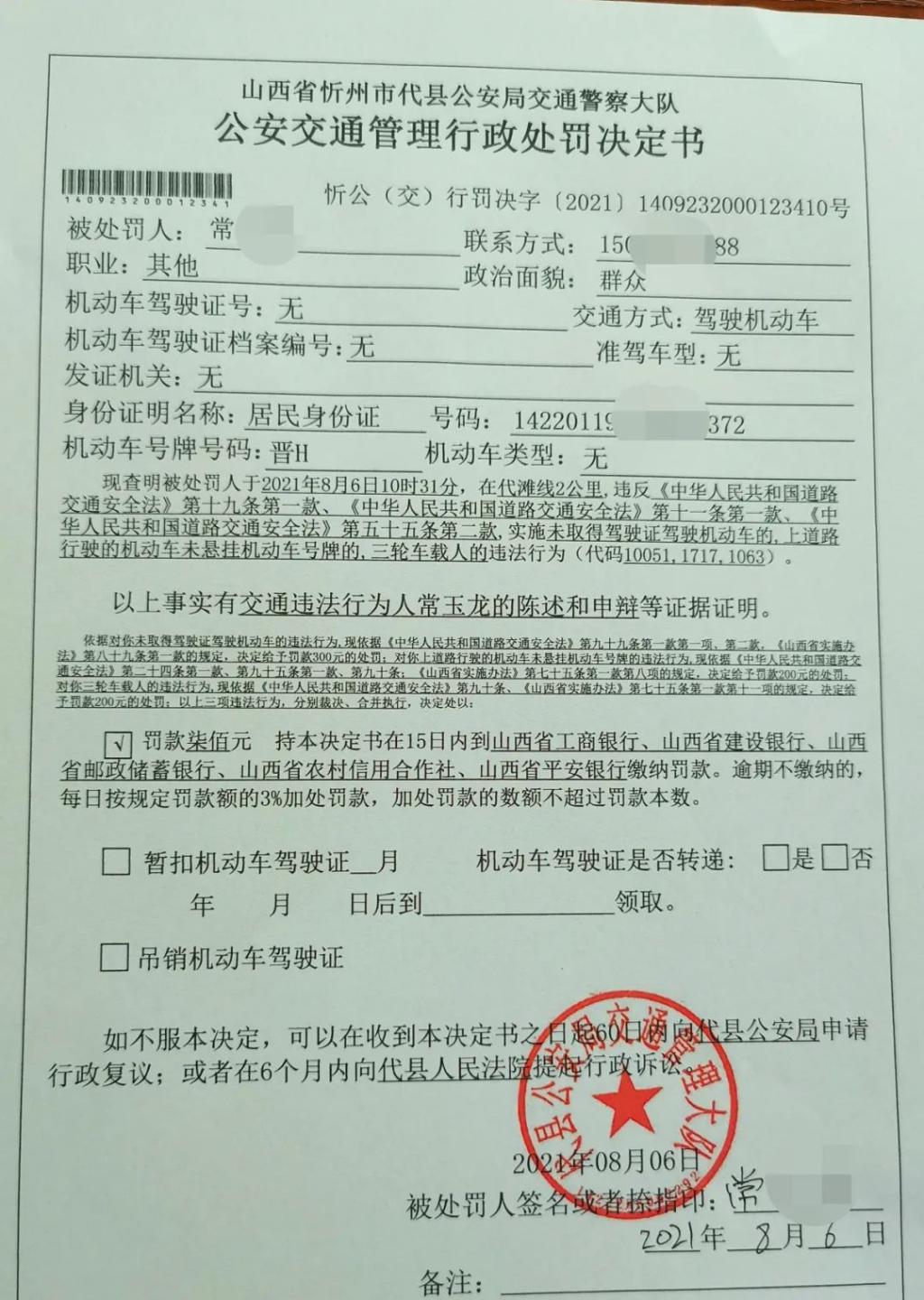 2021年8月6日10時31分許,忻州市代縣縣鄉(xiāng)公路代灘線2KM處。一輛未懸掛車牌、違法載人的農(nóng)用三輪車駛?cè)氪h交警設立的臨時檢查通道。