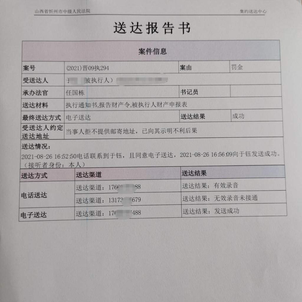 這是忻州中院執(zhí)行的一起罰金案件,執(zhí)行法官窮盡傳統(tǒng)手段一直聯(lián)系不到被執(zhí)行人,通過查控系統(tǒng)只查到被執(zhí)行人名下有少量財(cái)產(chǎn)。后通過電子送達(dá)平臺迅速聯(lián)系到被執(zhí)行人,被執(zhí)行人賀某某主動與執(zhí)行法官聯(lián)系,因其經(jīng)濟(jì)困難,無法一次性繳納全部罰金,先主動繳納5000元罰金,剩余罰金每月分期進(jìn)行繳納。
