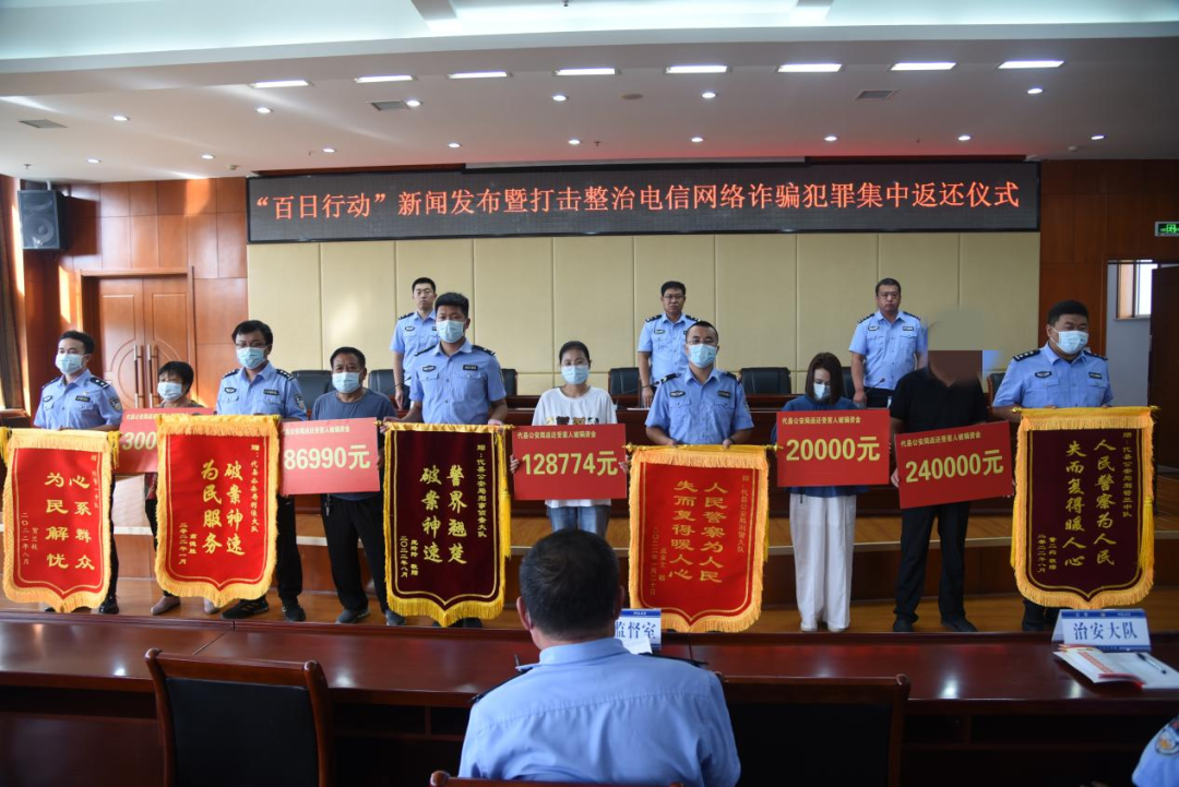 8月19日下午,代縣公安局舉行“百日行動(dòng)”新聞發(fā)布暨打擊整治電信網(wǎng)絡(luò)詐騙犯罪集中返還儀式?;顒?dòng)現(xiàn)場返還了5名受損群眾被騙資金共計(jì)49萬余元。