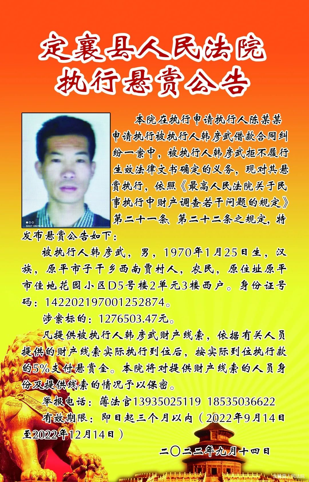 本院在執(zhí)行申請執(zhí)行人陳某某申請執(zhí)行被執(zhí)行人韓彥武借款合同糾紛一案中,被執(zhí)行人韓彥武拒不履行生效法律文書確定的義務,現(xiàn)對其懸賞執(zhí)行,依照《最高人民法院關(guān)于民事執(zhí)行中財產(chǎn)調(diào)查若干問題的規(guī)定》第二十一條、第二十二條之規(guī)定,特發(fā)布懸賞公告如下: