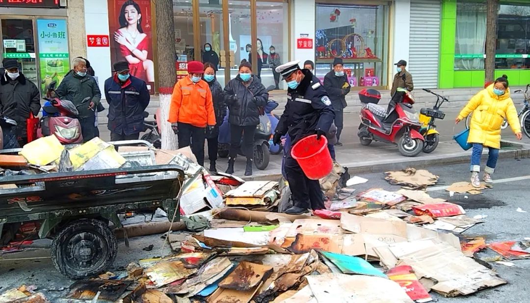 險情就是警情。兩位交警迅速喊話三輪車駕駛員下車避險,疏散圍觀群眾,疏導過往車輛,同時,從臨街門店借來滅火器緊急滅火。此時,附近的熱心群眾也遞來水桶,幫助執(zhí)勤交警一起滅火。