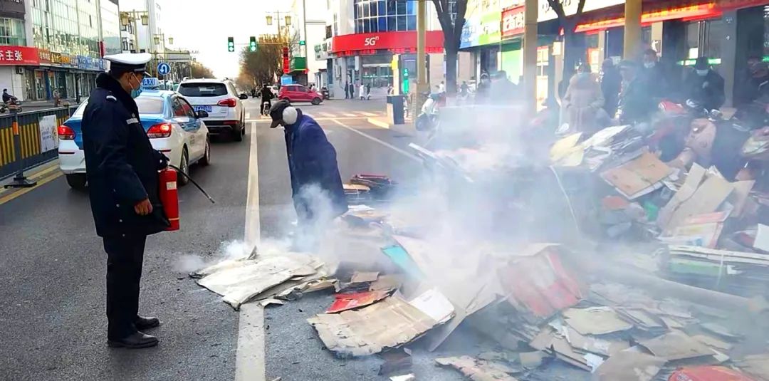 正在執(zhí)勤的兩名交警李春生、胡翔忽然聞到一股煙味,仔細查看四周,原來是停在路口等待紅燈的一輛三輪車上冒起白煙,整車的廢紙片就要燃起,但三輪車駕駛員仍未察覺。