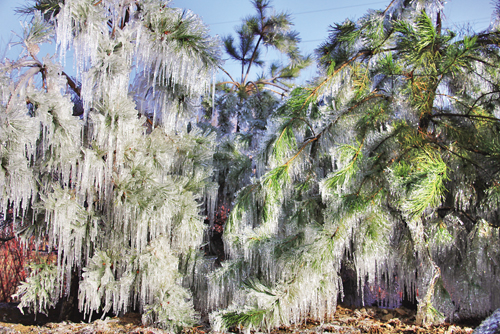 3月26日早晨,原平市交通公園的各種風(fēng)景樹木驚現(xiàn)樹掛冰凌奇觀,蔚為壯觀,吸引了市民前來觀賞。據(jù)了解,該樹掛冰凌是公園工作人員對各種花草樹木進(jìn)行春澆噴灌時,由于早晨溫度較低,噴灌的霧狀水滴集結(jié)而成,到上午太陽光照下,此奇觀已經(jīng)消失。(吉建平 攝)