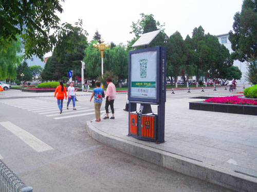 6月4日太陽能果皮箱亮相原平市街道兩旁。該市引進的新型太陽能環(huán)保亮化分類果皮箱,帶有太陽能發(fā)電,晚上自動亮燈照明,方便垃圾處理、回收利用,受到群眾歡迎。(趙春曉 攝)