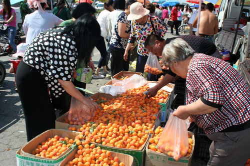 6月12日,被譽為大杏之村原平市解村鄉(xiāng)余家溝村的農(nóng)民正在集貿市場賣大杏,市民們正在挑選購買很受青睞。該市大力發(fā)展一村一品水果種植栽培業(yè),多措并舉促進了農(nóng)民增收。(趙春曉 攝)