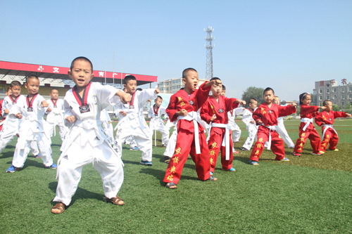 7月17日,孩子們在原平市農(nóng)?;顒又行木毩?xí)跆拳道。暑假期間,該市許多青少年投入到另一種學(xué)習(xí)狀態(tài),選擇學(xué)習(xí)跆拳道、舞蹈、書法、美術(shù)、音樂等,感受精彩的藝術(shù)世界,豐富暑假生活。(褚震 攝)