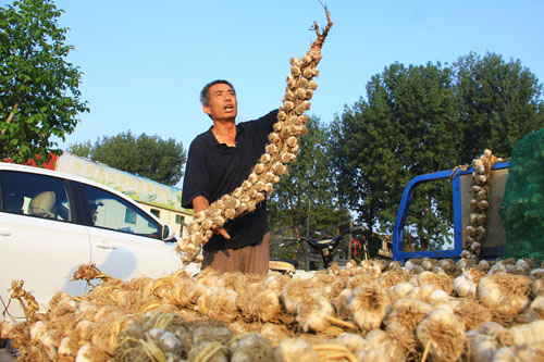 7月30日,原平市陽(yáng)房村蒜農(nóng)正在農(nóng)產(chǎn)品市場(chǎng)銷售紫皮蒜。原平紫皮蒜是當(dāng)?shù)氐钠放妻r(nóng)產(chǎn)品,盛產(chǎn)于滹沱河沿岸的新原鄉(xiāng)和西鎮(zhèn)鄉(xiāng),不僅是調(diào)味佳品,而且食用具有藥用價(jià)值,省內(nèi)外客商慕名而來(lái)購(gòu)買,深受歡迎。(吉建平 攝)