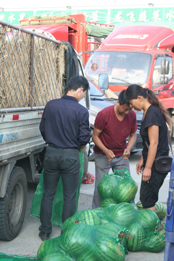 暑期天氣赤日炎炎,8月7日,原平市德金集貿(mào)瓜果蔬菜市場大西瓜貨豐價穩(wěn)購銷兩旺,市民們紛紛購買防暑解熱。(趙春曉 攝)