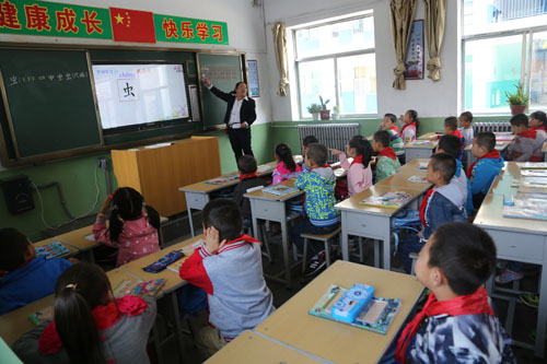 近日,在靜樂(lè)縣愛(ài)樂(lè)希望小學(xué),學(xué)生正通過(guò)交互式多媒體教學(xué)方法上課。老師高興地說(shuō):“有了多媒體真方便,以前講一個(gè)例題要花幾分鐘抄寫(xiě)在黑板上,現(xiàn)在只需幾秒鐘就顯示在頻幕上,既節(jié)省時(shí)間又提高課堂效率?!苯陙?lái),該縣加大教育投資力度,改善辦學(xué)條件,為學(xué)生上課提供便利。(閆曉梅 攝)