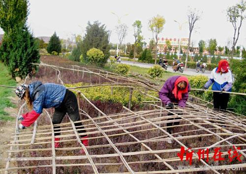 入冬以來,隨著氣溫逐漸下降,我市各地的綠籬植物紛紛住進了“防寒屋”。圖為河曲縣濱河濕地公園正組織員工,用竹竿、竹片為綠籬植物搭建拱棚骨架,保障不耐寒的綠植順利越冬