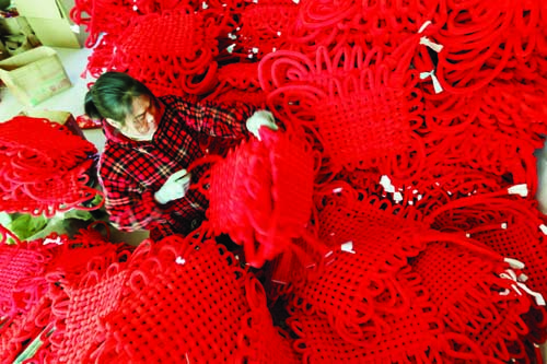 1月11日,在山東省臨沂市郯城縣紅花鎮(zhèn)一家工藝品廠,工人在整理中國(guó)結(jié)。春節(jié)臨近,山東臨沂、棗莊等地的節(jié)慶飾品車間、手工藝人開始忙碌起來,人們加緊制作各種春節(jié)飾品,供應(yīng)市場(chǎng)。據(jù)新華社 張春雷 攝