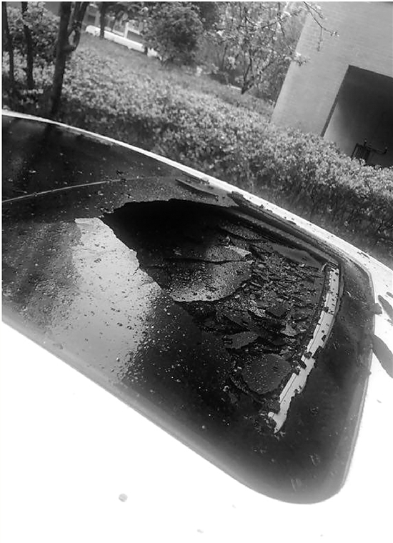 李師傅說:“3月29日一大早,我女兒送孩子上學(xué),車子就停在15幢樓下。我女兒自己都沒發(fā)現(xiàn),準(zhǔn)備開車走了。外孫女坐在后座,她說媽媽,我們車頂怎么有個(gè)窟窿了。我女兒下車一看,驚呆了,馬上給我打電話。”