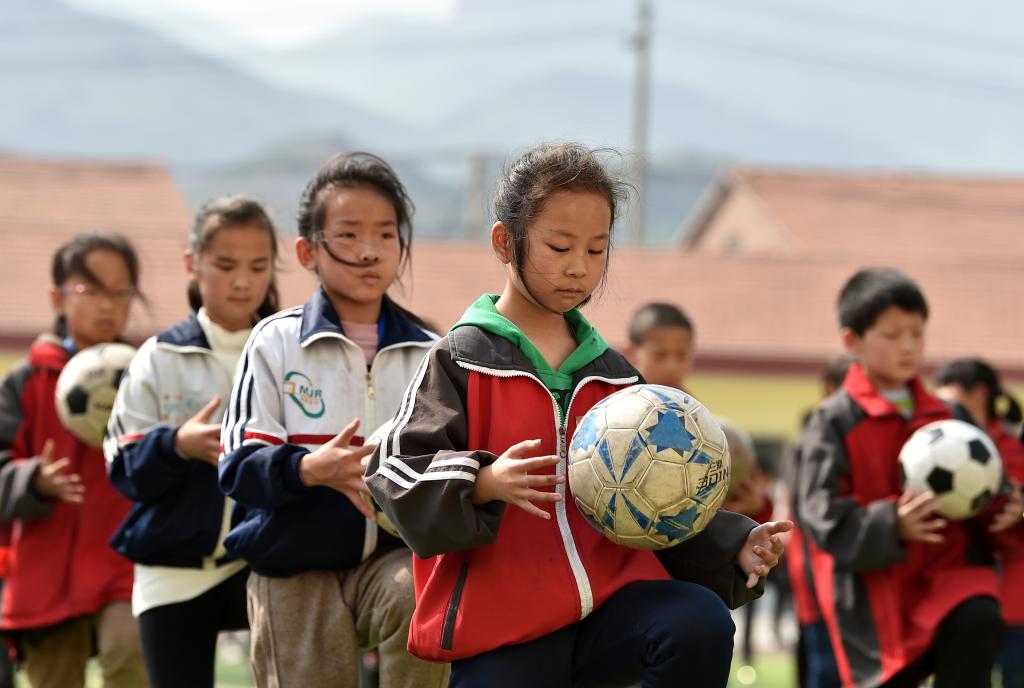 ↑這是學生們在做足球操(4月18日攝)。新華社記者詹彥攝
