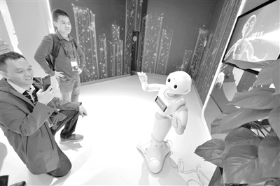 5月26日,參觀者在2019中國國際大數(shù)據(jù)產(chǎn)業(yè)博覽會上與5G+智能機器人進行拍照互動。記者 楊文斌 攝