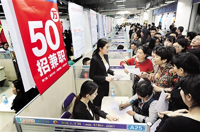 23日上午11點,重慶市江北區(qū)觀音橋一家人才招聘市場內,一個掛著“五十萬招兼職”海報的招聘展位前人頭攢動。排隊等候填表報名的人將兩米寬的過道塞得滿滿當當。