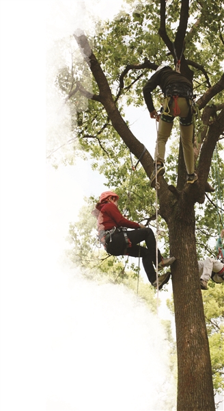 韓驚雷表示:“在攀樹前,會(huì)在樹枝上安裝上樹木保護(hù)器,樹木保護(hù)器實(shí)際上是一根兩頭帶著圓環(huán)的扁帶,寬2.5厘米,在攀樹過(guò)程中,它是唯一與樹木直接接觸的工具,可以避免繩索摩擦破壞樹木,以保護(hù)樹皮不受損,這樣的訓(xùn)練,不僅不會(huì)破壞樹木的生長(zhǎng),反而會(huì)對(duì)樹木起刺激作用,促進(jìn)樹木的生長(zhǎng)?!?/p>