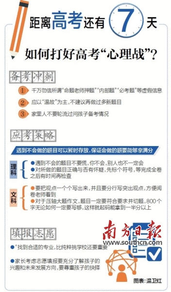 張敏強(qiáng)不忘囑咐家長,要創(chuàng)造寬松、良好的環(huán)境,讓考生輕松上陣?!耙欢ㄒ尯⒆有菹⒑?,補(bǔ)品不要吃太多,家里其他的人,不要每個(gè)人都過問。”他還提醒,所有的高考用具,要備份一套。